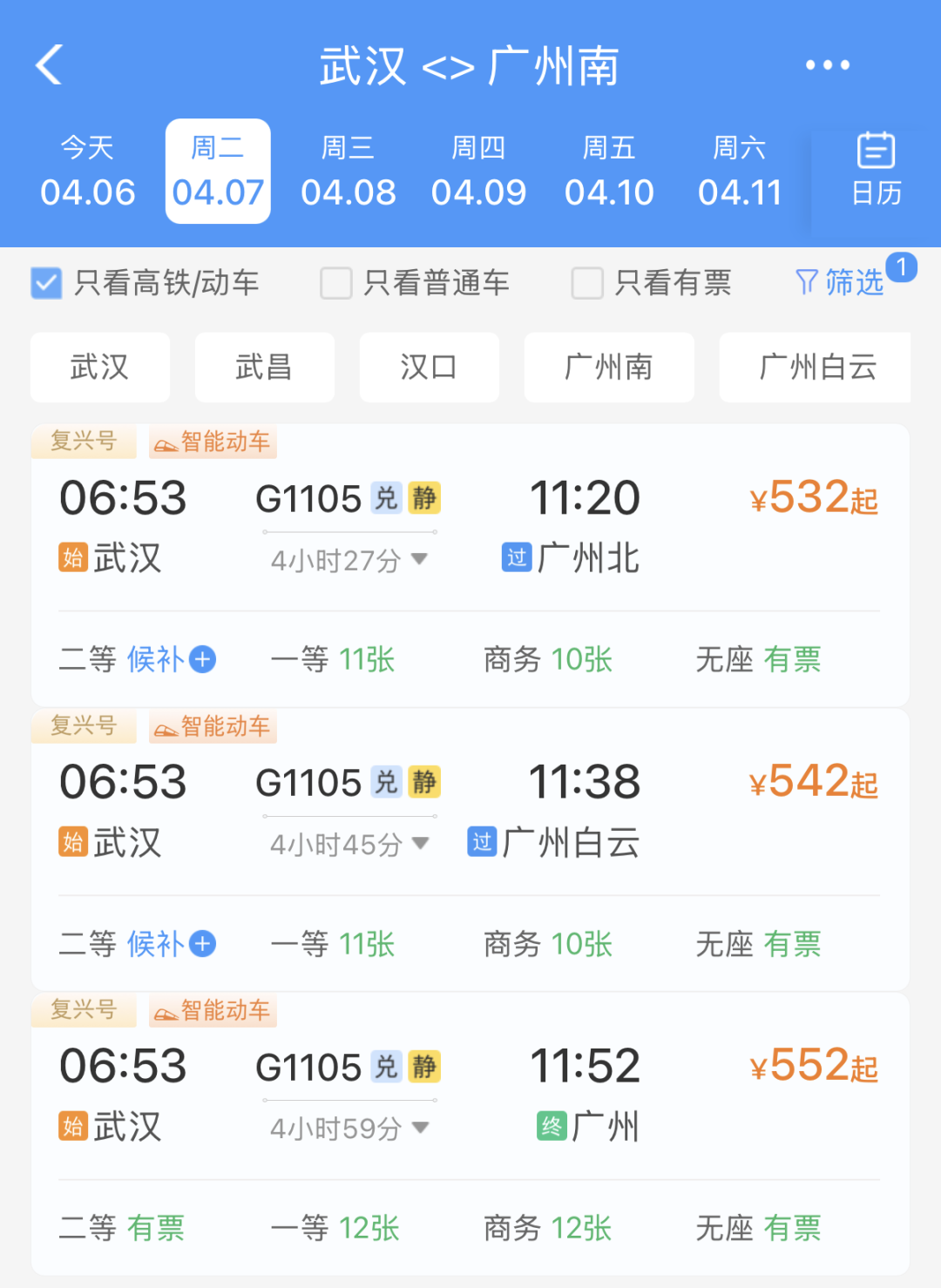 武广、沪昆等6条中西部干线、城际线普涨20%左右,像武汉到广州南二等座,从460多元涨到552元。