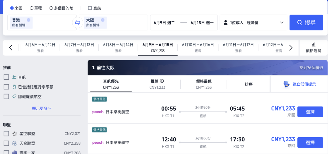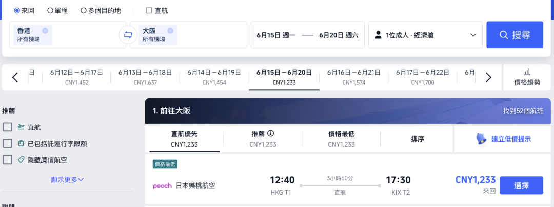 1、乐桃航空,6月多日期,香港=大阪1K2,退完税到手1K