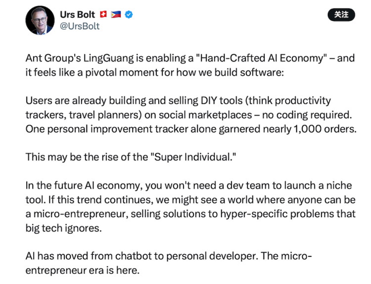 这种模式的爆发力在于其极低的门槛。一位海外网友在Urs Bolt的推文中精辟地总结道:“这代表了软件创作的民主化。在这个新时代,创造力和洞察力比企业规模更重要。”