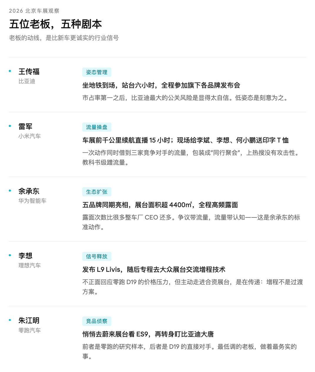 开幕当天,王传福坐地铁赶到展馆,从早上九点站到下午三点;雷军在竞争对手展台之间穿梭,给李斌、李想、何小鹏各送了一件印字T恤;朱江明悄悄溜进蔚来展台研究产品,又转身去盯他刚发布的D19直接对手,比亚迪大唐。