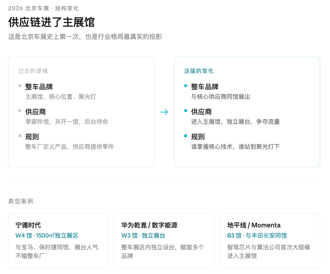 这届车展“整零同馆”是第一次发生,供应链企业进入主展馆与整车品牌同台,也算是历史时刻了。