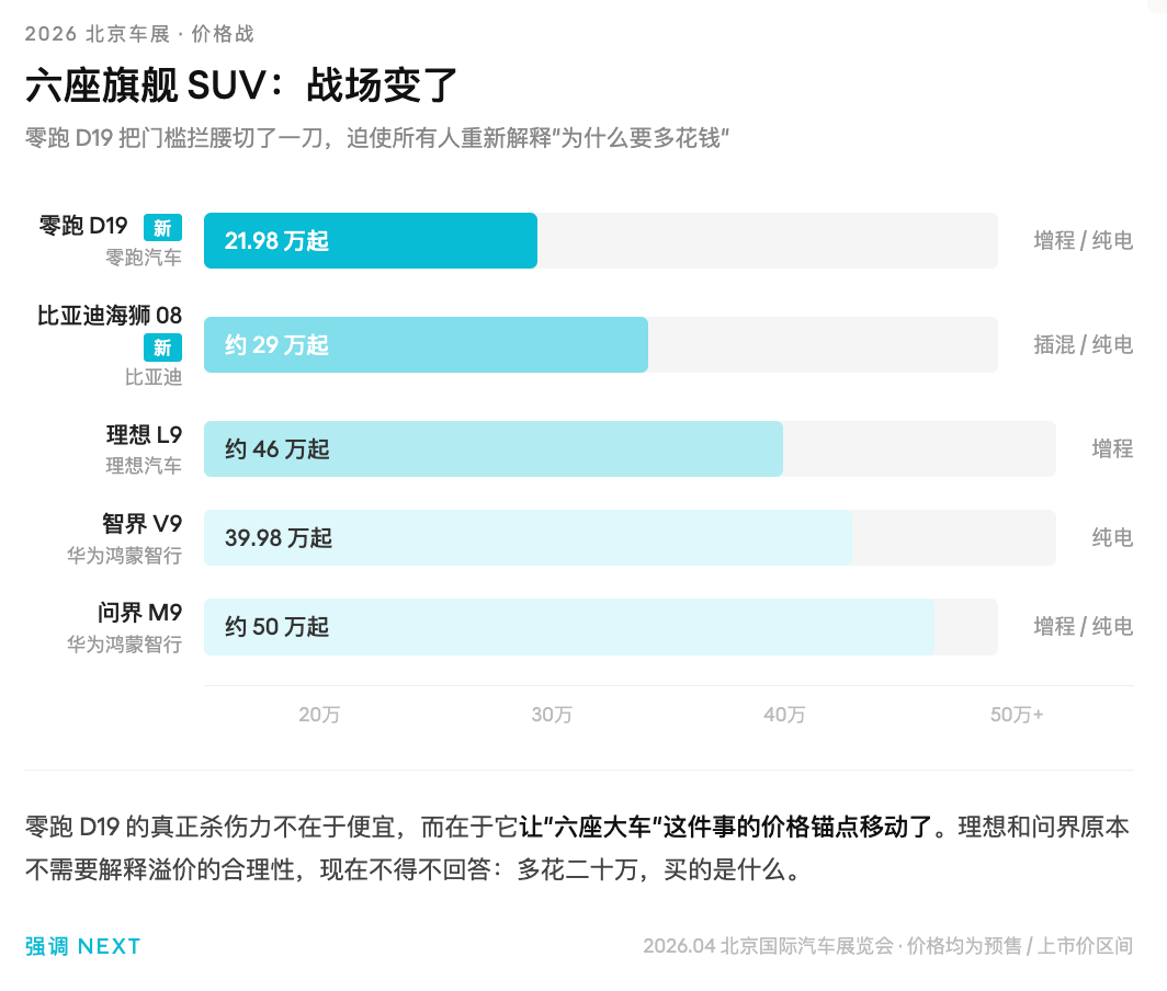 理想在六座SUV赛道面临的压力是真实的。零跑D19以21.98万元起售,直接把大型六座的价格底线拉低了将近一半。理想L9的用户为什么要多花十几万?李想没有在车展上正面回应这个压力,而是加快新车发布节奏。