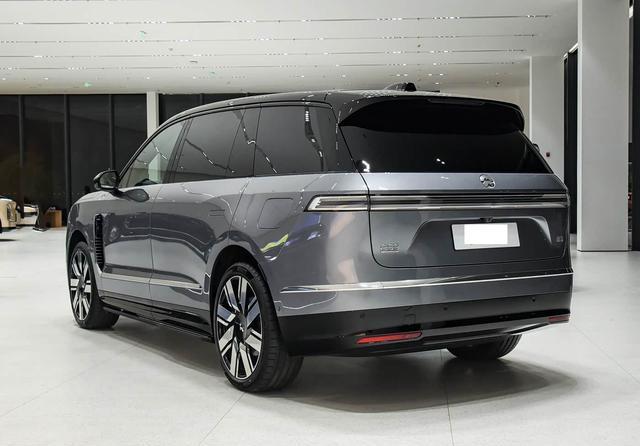 再来看车尾部分,蔚来ES9的车尾设计同样亮点十足,同级最长的流光飞簇光?尾灯,全线贯通的三段式灯组,点亮后如同一条璀璨的星河,为车尾增添了不少精致感。尾灯上方的镀铬饰条与车头、车身侧面的装饰条相呼应,形成了一个完整的视觉闭环。车尾整体线条略微收缩,营造出一种灵动的运动感,与车头的方正威严形成了鲜明的对比。后保险杠下方的扩散器设计,进一步提升了车尾的运动气息。